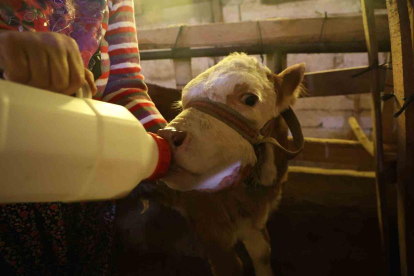 Annesi ölen buzağıyı elleriyle besliyorlar