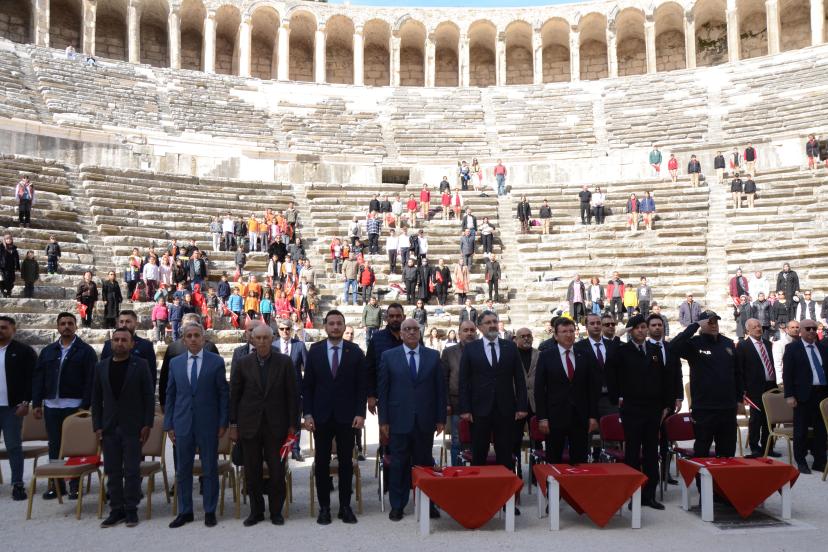 İlk Tören Cumhuriyet Meydanı'ndaki Atatürk büstü önünde saygı duruşu, İstiklal Marşı ve ardından çelenk sunumuyla başladı. Buradaki törenin ardından etkinlikler Tarihi Antik Aspendos Antik Tiyatrosu'nda devam etti. Antik tiyatrodaki törene Kaymakam Cemal Şahin, Belediye Başkanı Kadir Kumbul, İlçe Jandarma Komutanı Üsteğmen Ali Duman, İlçe Milli Eğitim Müdürü İkram Ekiz, kurum müdürleri, STK temsilcileri, öğretmenler, vatandaşlar ve öğrenciler katıldı.
