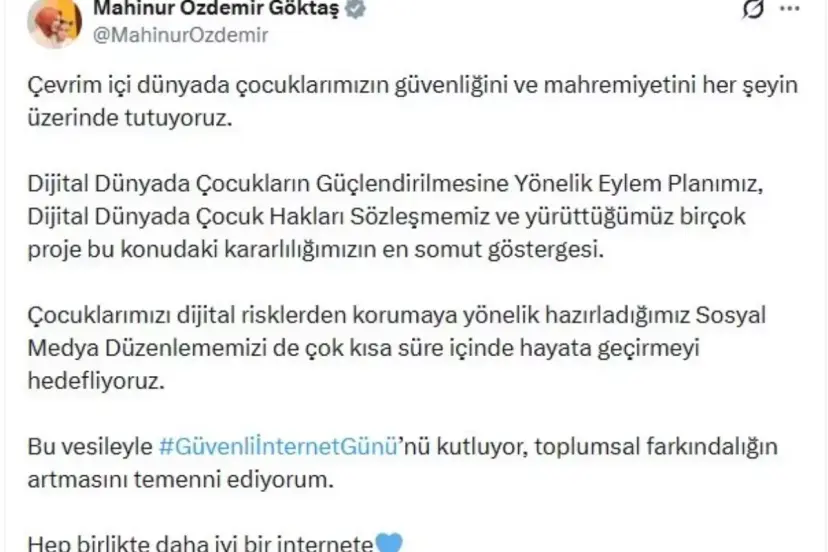 Aile ve Sosyal Hizmetler Bakanı Mahinur Özdemir Göktaş, 10 Şubat Güvenli İnternet Günü vesilesiyle yaptığı açıklamada çocukların çevrim içi güvenliğine dikkat çekti ve toplumsal farkındalığın artmasını istedi.