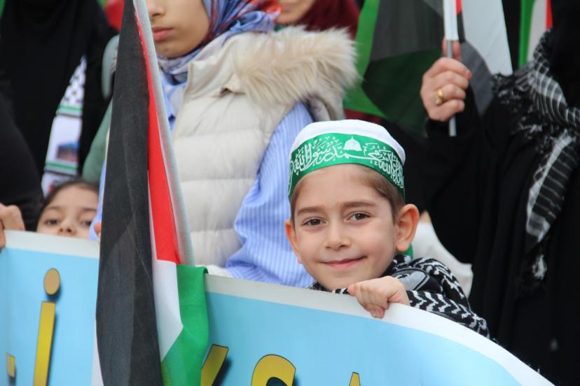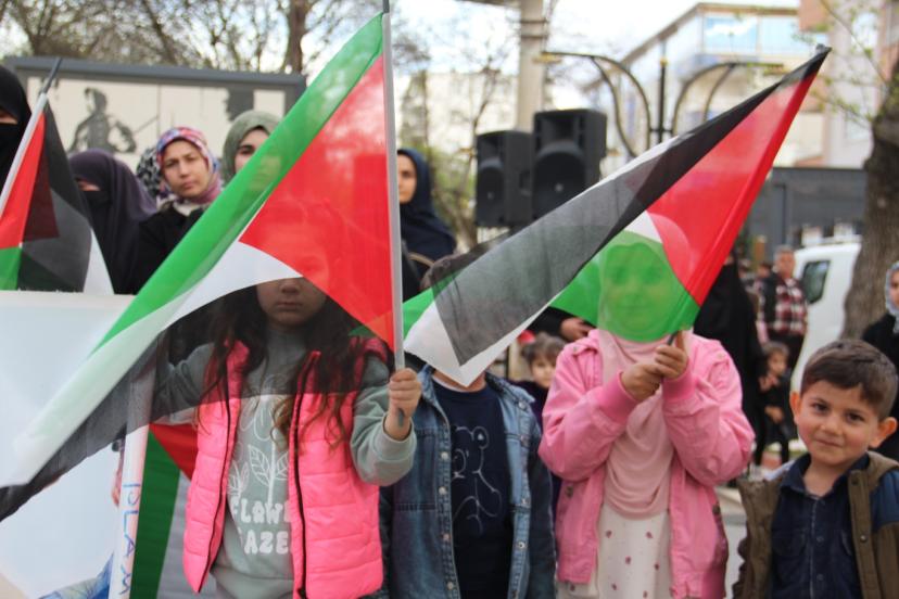 Ellerinde pankartlar taşıyan katılımcılar, Mescid-i Aksa’nın özgürlüğü ve Filistin halkının hakları için çağrıda bulundu.