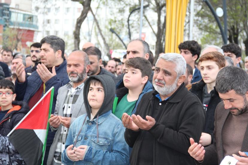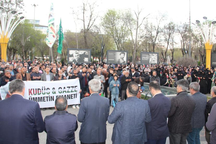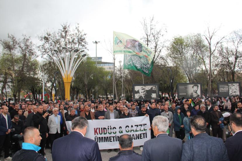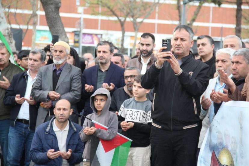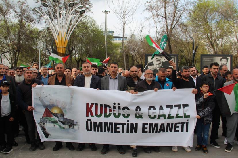 Basın açıklamasını okuyan Cengiz Arı, "İnsanlığın ortak mirası, İslam dünyasının ilk kıblesi ve Müslümanların kutsal harem-i şerifi olan Mescid'i Aksa'nın, gasıp israil tarafından haksız gerekçelerle ibadete kapatılması ve Müslümanların en temel hakkı olan din ve vicdan hürriyetinin engellenmesi büyük bir endişe ve infialle karşılanmıştır. Mescid'i Aksa, sadece Filistin halkının değil, tüm İslam aleminin kalbidir. Bu kutsal mekanın kapılarına 35 gündür kilit vurulması; uluslararası hukukun, insan haklarının ve inanç özgürlüğünün açıkça ihlalidir. Mescid'i Aksa'nın ibadet edenlere kapatılması Kudüs tarihinde ilk kez yaşanan bir durumdur. Bu yapılan açık bir zulümdür." ifadelerini kullandı.