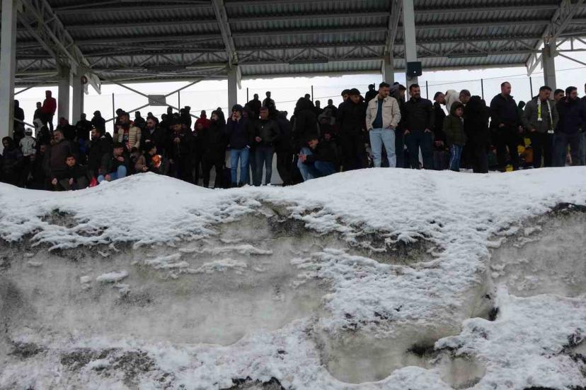 Soğuk havaya ve zorlu şartlara aldırış etmeyen taraftar, adeta karla kaplı bir seyir terası oluşturarak takımlarına destek verdi.