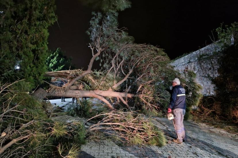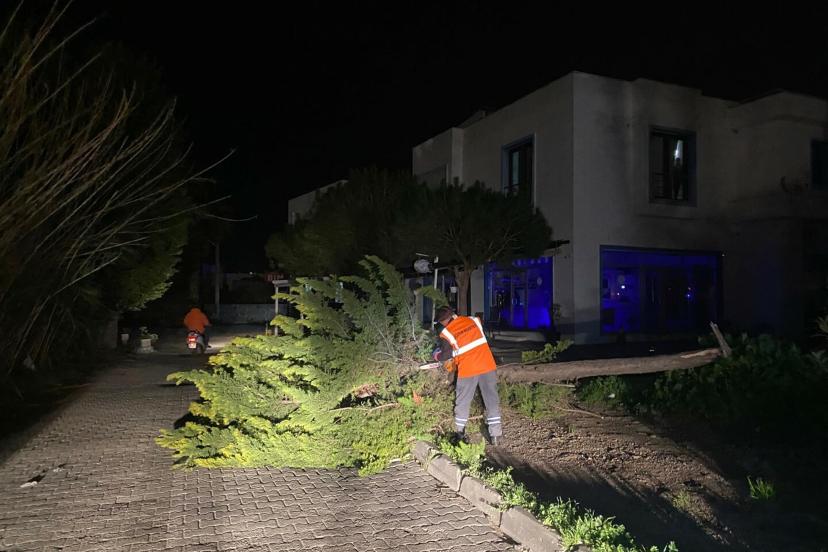 Bodrum Belediyesi ekipleri, ilçe genelinde, dün sabah saatlerinden itibaren tekili olan fırtına nedeniyle teyakkuza geçti. Gelen ihbarları değerlendiren belediye ekipleri, aynı anda çok sayıda ağacın devrilmesi üzerine yoğun mesai harcadı. Toplam 80 olaya müdahale eden ekipler, özellikle yollara devrilen ağaçları kısa sürede kaldırarak ulaşımın aksamaması için çalışmalarını sürdürdü.