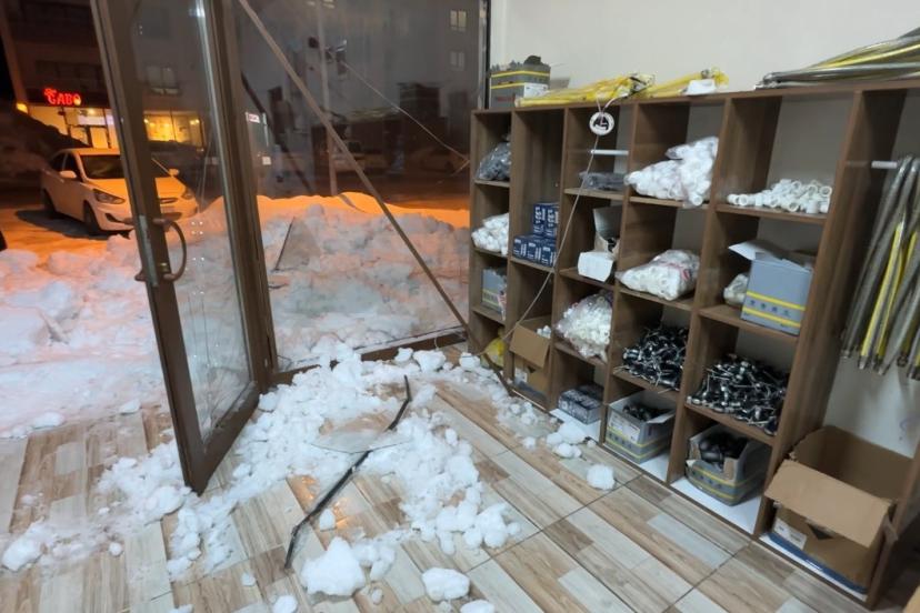 Esenyurt Mahallesi’nde bulunan sitedeki bir binanın çatısında biriken kar ve buz kütleleri büyük bir gürültüyle düştü. O esnada zemin katta bulunan Cenk Akbıyık’a ait doğal gaz dükkanının vitrini, düşen kütlelerin basıncıyla patladı. Parçalanan camlar ve yerinden sökülen çerçeveler içeriye savruldu.