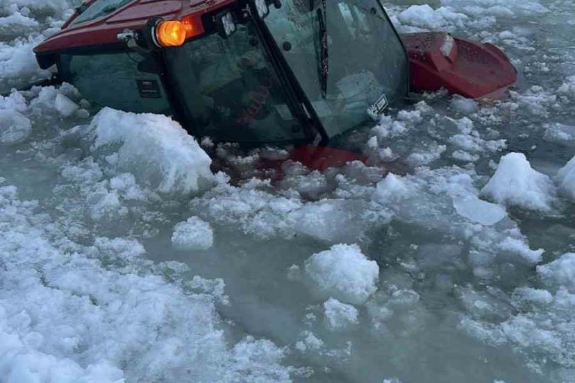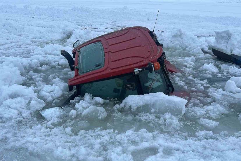 Ardahan’ın Çıldır ilçesindeki yüzeyi buz tutan Çıldır Gölü üzerinde kar temizleme çalışması yapan traktör, buzun kırılması sonucu suya gömüldü, sürücü son anda kurtarıldı.