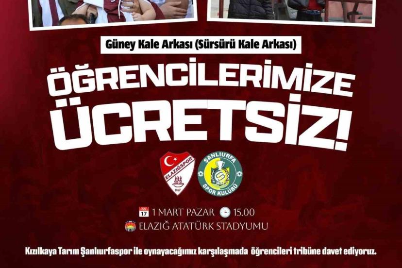 TFF 2. Lig Beyaz Grup’un 28. Haftası’nda Şanlıurfaspor’u konuk edecek olan Elazığspor’da yönetim kurulu kararıyla kale arkası tribün biletleri 17 yaş altı öğrencilere ücretsiz yapıldı. Elazığspor Kulübü’nden yapılan açıklamada; "Haydi gençler, yeriniz hazır. Güney Kale Arkası (Sürsürü Kale Arkası) Tribünü, 17 yaş ve altındaki öğrenciler için ücretsizdir. Öğrenciler, öğrenci kimlik kartlarını stadyum girişindeki görevlilere göstererek davetiyelerini ücretsiz alıp maça giriş yapabileceklerdir" denildi.