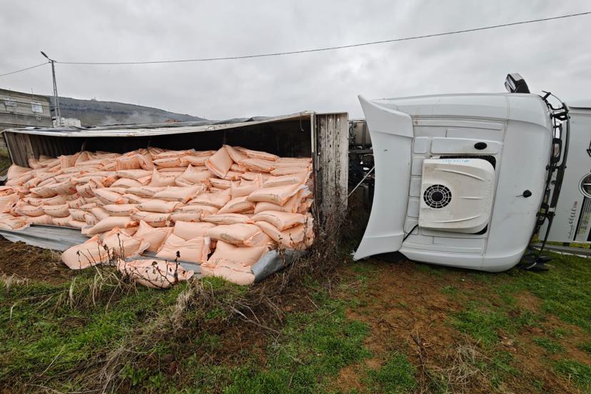 Devrilmenin etkisiyle tırda yüklü olan gübreler yola savruldu.