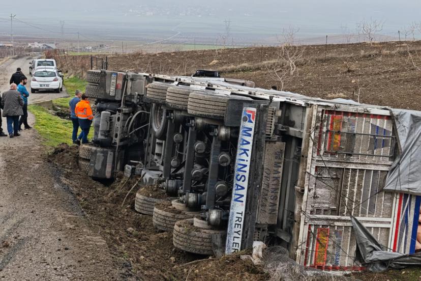 Edinilen bilgilere göre, henüz bilinmeyen bir nedenle kontrolden çıkan tır yol kenarına devrildi.