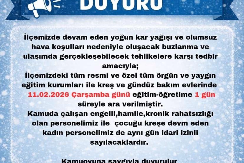 Karlıova Kaymakamlığı’ndan yapılan açıklamada, "İlçemizde devam eden yoğun kar yağışı ve olumsuz hava koşulları nedeniyle oluşacak buzlanma ve ulaşımda gerçekleşebilecek tehlikelere karşı tedbir amacıyla; ilçemizdeki tüm resmi ve özel tüm örgün ve yaygın eğitim kurumları ile kreş ve gündüz bakım evlerinde 11.02.2026 çarşamba günü eğitim-öğretime 1 gün süreyle ara verilmiştir. Kamuda çalışan engelli, hamile, kronik rahatsızlığı olan personelimiz ile çocuğu kreşe devam eden kadın personelimiz de aynı gün idari izinli sayılacaklardır" denildi.
