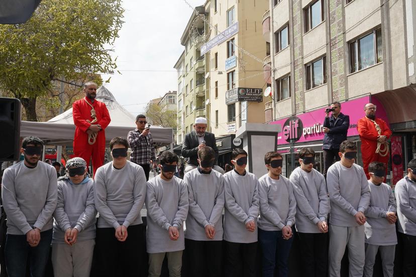 Konya Sivil Toplum Platformu tarafından düzenlenen Gazze'ye destek yürüyüşte, Filistinli mahkumlara dikkat çekmek amacıyla temsili canlandırmalar yapıldı.
