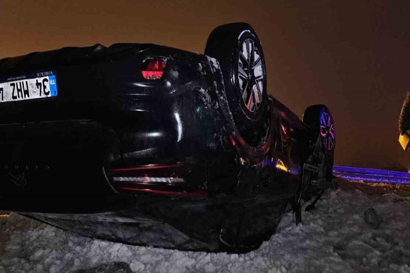 Muş-Erzurum karayolunda karla karışık yağmur nedeniyle kayganlaşan yolda kontrolden çıkan otomobil takla atarak şarampole yuvarlandı.