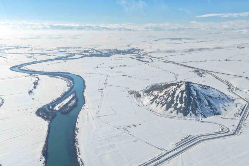 ’Muş Piramidi’ olarak bilinen Mercimek Kale Höyüğü, etkili olan kar yağışının ardından beyaz örtüyle kaplanarak eşsiz görüntüler sundu.