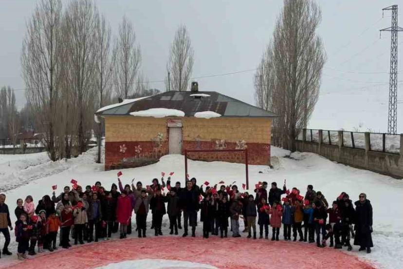 Ağrı’nın Taşlıçay ilçesinde Düzgören İlkokulu ve Ortaokulu öğrencileri kar üzerine Türk bayrağı yaptı.