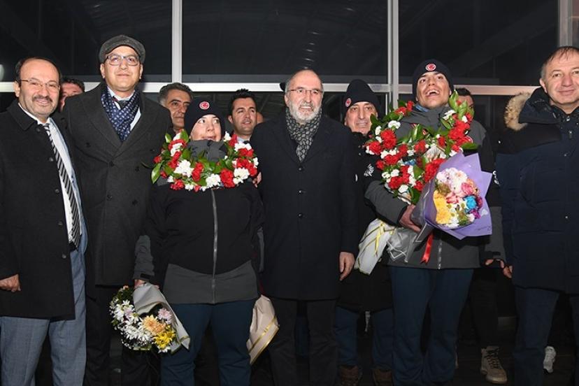 Avusturya’dan dört madalya ile Erzurum’a dönen Bingül kardeşler için havalimanında karşılama töreni düzenlenirken alanda ETÜ Rektörü Prof. Dr. Bülent Çakmak’ın yanı sıra çok sayıda akademisyen ve öğrenci yer aldı.