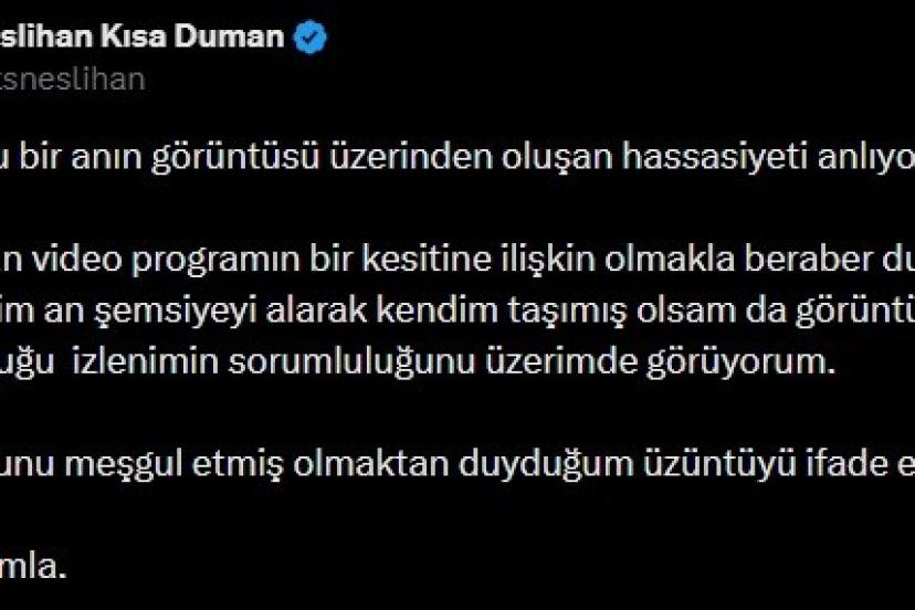 Tepkiler üzerine yazılı açıklama yapan Duman, görüntülerin yağmurlu bir ana ait olduğunu belirterek, "Yağmurlu bir anın görüntüsü üzerinden oluşan hassasiyeti anlıyorum. Paylaşılan video programın bir kesitine ilişkin olmakla beraber durumu fark ettiğim an şemsiyeyi alarak kendim taşımış olsam da görüntünün oluşturduğu izlenimin sorumluluğunu üzerimde görüyorum. Kamuoyunu meşgul etmiş olmaktan duyduğum üzüntüyü ifade etmek isterim" ifadelerini kullandı.