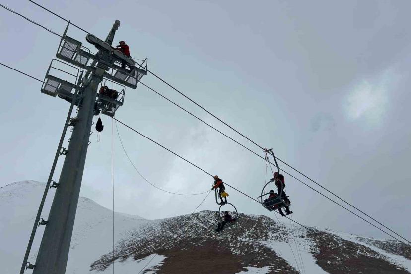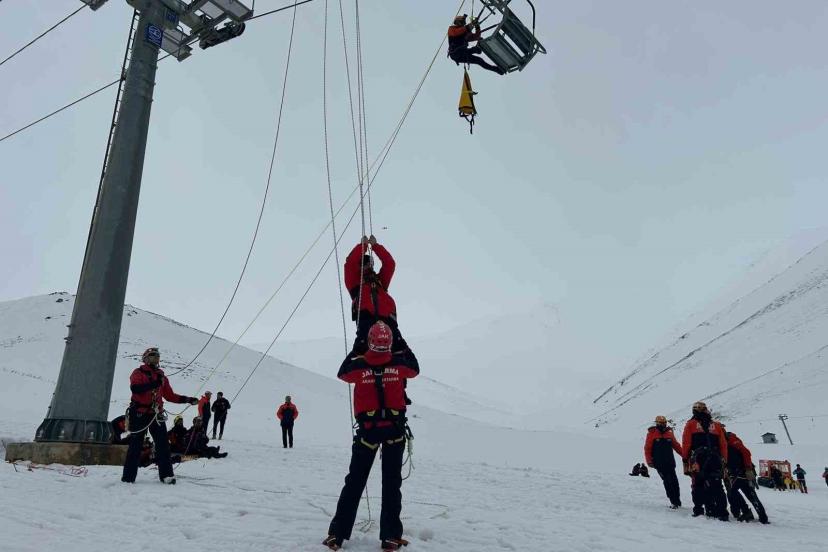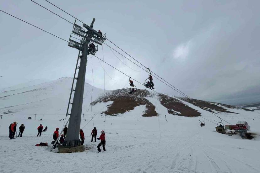 Senaryo gereği kayak merkezinde meydana gelen çığ nedeniyle elektrik kesintisi yaşanırken, telesiyejde 4 kişi mahsur kaldı. Olay yerine sevk edilen ekipler, telesiyejde mahsur kalanları güvenli şekilde tahliye ederek aşağı indirdi.