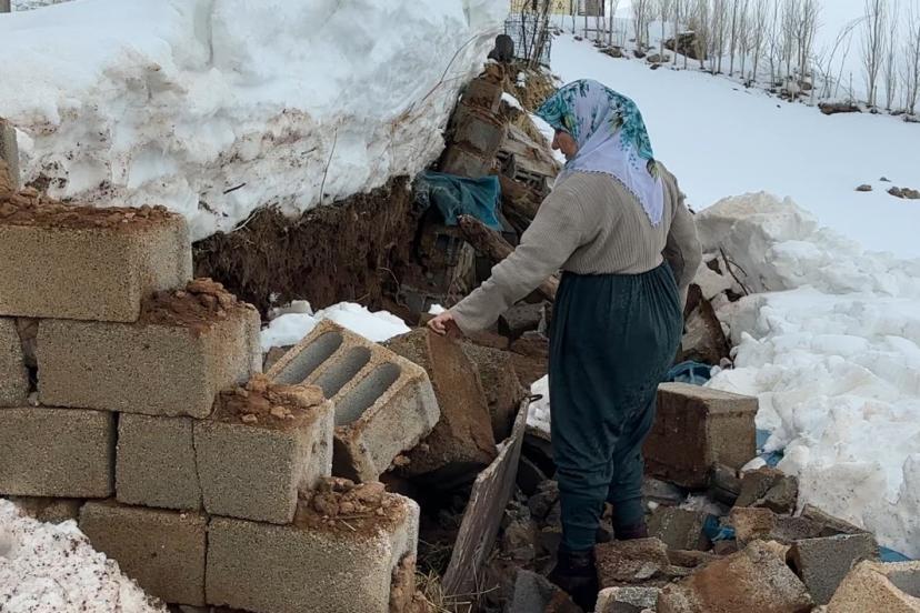 Yüksekova-Esendere yolu üzerindeki Sarıtaş köyünde hayatın tüm yükünü omuzlarında tek başına taşıyan Zine Yaşar, kışın en sert darbesiyle sarsıldı. Eşi vefat eden ve çocukları yanında olmayan talihsiz kadın, son on yılın en yoğun kar yağışının yaşandığı bölgede ekmek kapısı olan ahırını kaybetti. Sabah saatlerinde büyük bir gürültüyle çöken ahır, Zine Teyze’nin dünyasını başına yıktı. Şans eseri koyunların içeride olmadığı o anlarda dışarı fırlayan yaşlı kadın, karşılaştığı manzara karşısında dizlerinin üzerine çöktü. Yıkılan ahırının harabesi başında gözyaşları içinde bekleyen Zine Teyze, çaresizliğini feryat ederek dile getirdi.