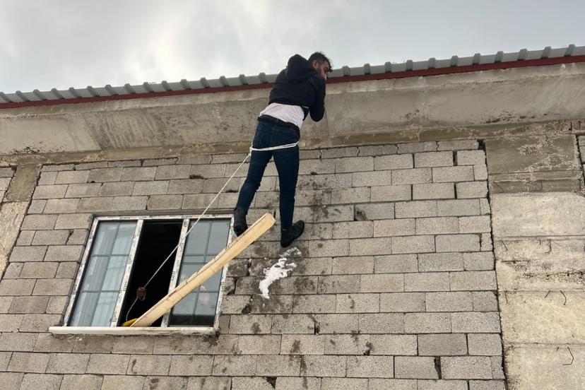 Hakkari’nin Yüksekova ilçesinde temizlik yaptığı çatıda ayağı kayan vatandaş, beline bağladığı ip sayesinde boşlukta asılı kalarak hayata tutundu.